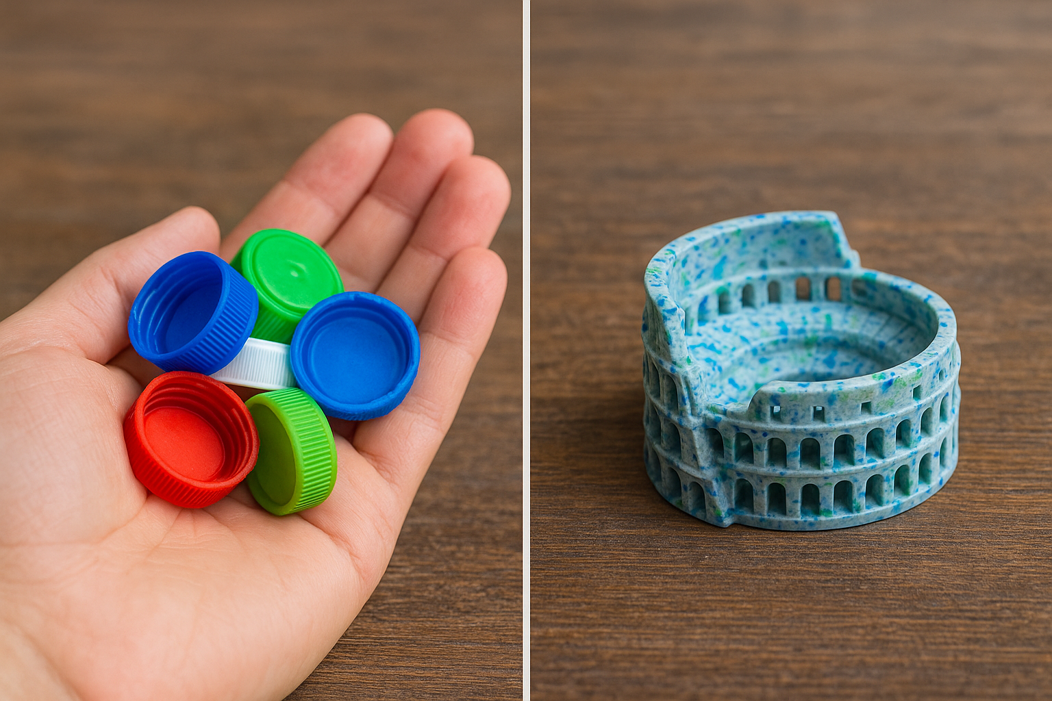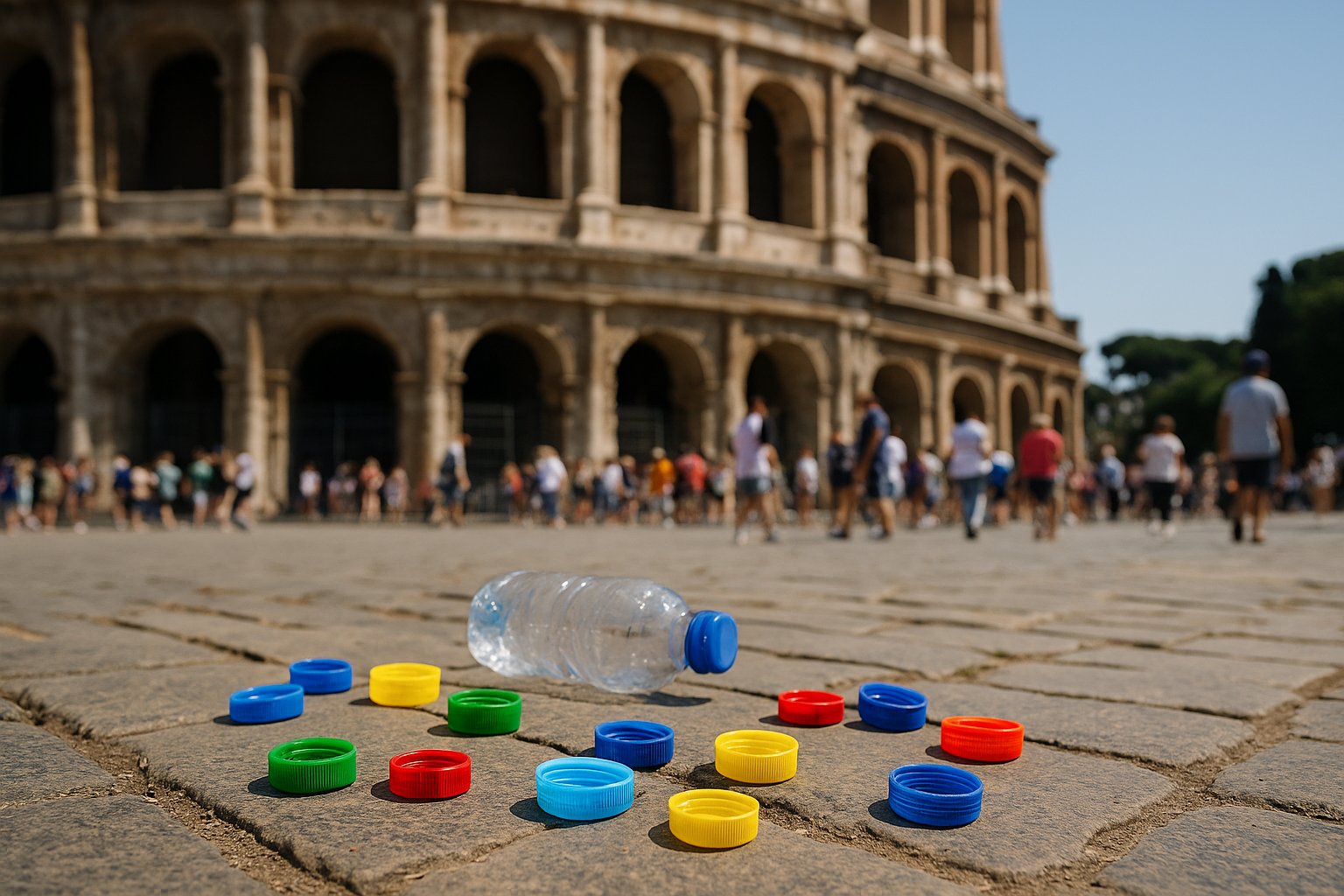 Outside the Coliseum in Rome, the streets are littered with plastic bottle caps—especially during hot summer days. Inside the gift shop, small 3D-printed busts and replicas sell for €6 or more, despite being made from virgin plastic and produced off-site.
