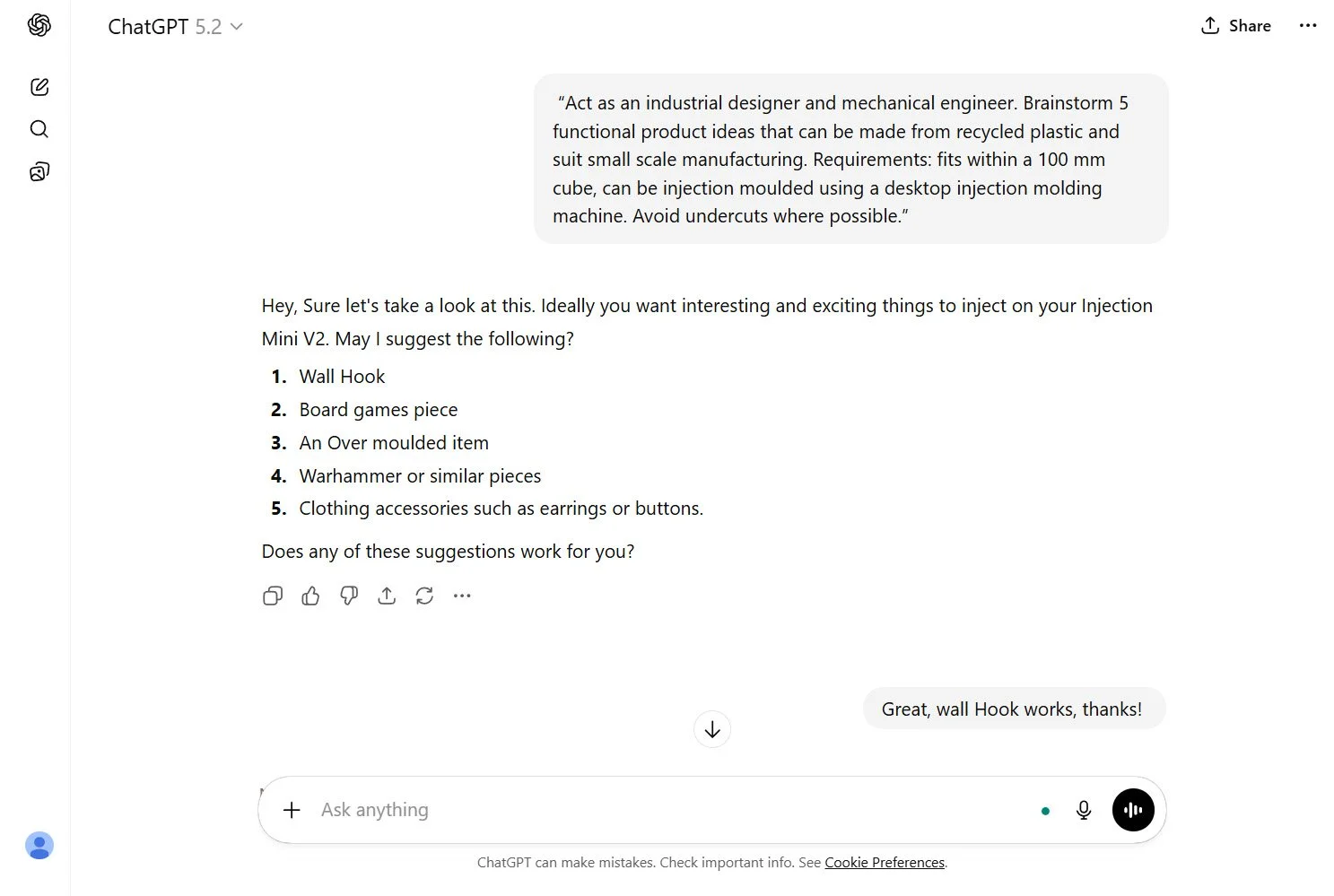 “Act as an industrial designer and mechanical engineer. Brainstorm 5 functional product ideas that can be made from recycled plastic and suit small scale manufacturing. Requirements: fits within a 100 mm cube, can be 3D printed first, and later adapted for Desktop Injection Moulding using a Desktop Injection Molding Machine. Avoid undercuts where possible.”