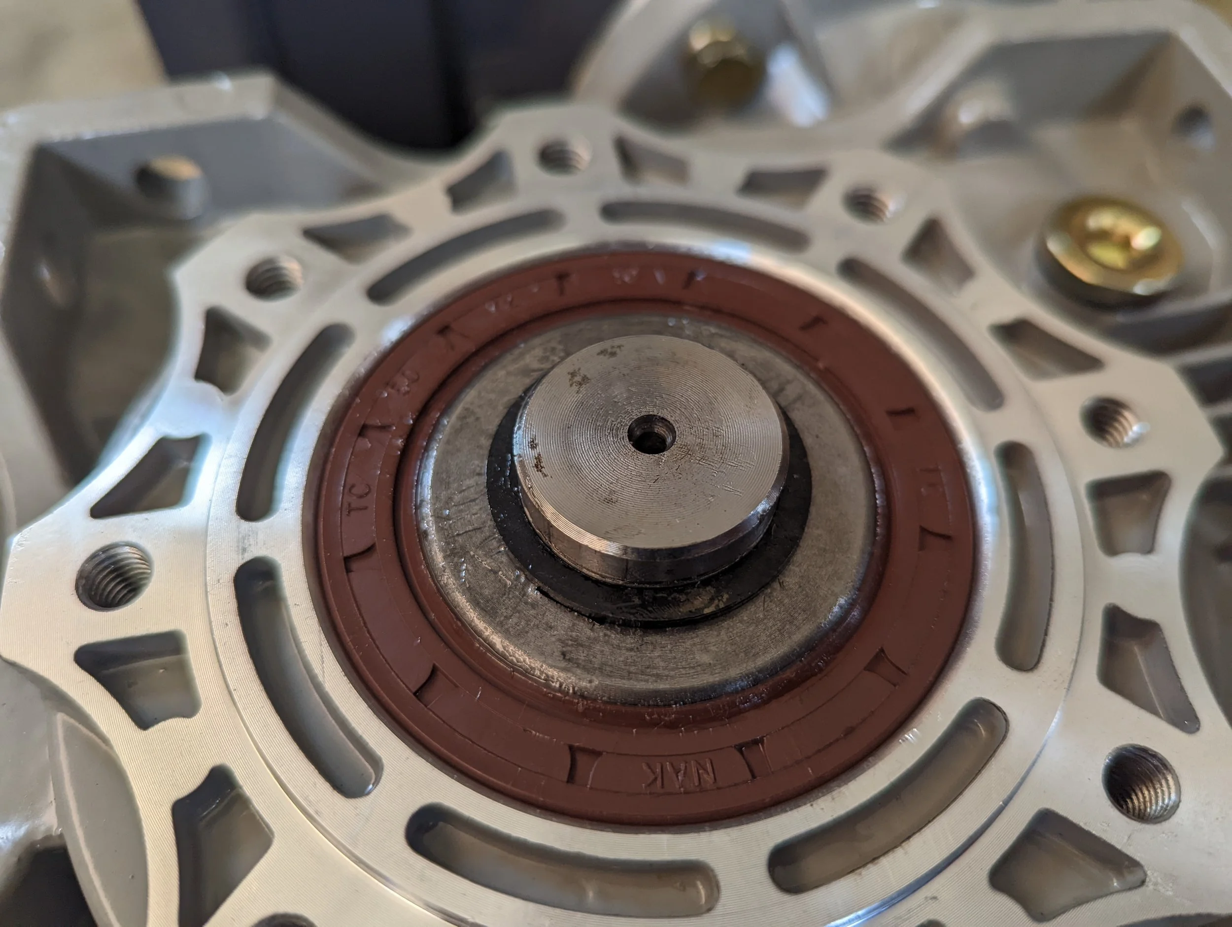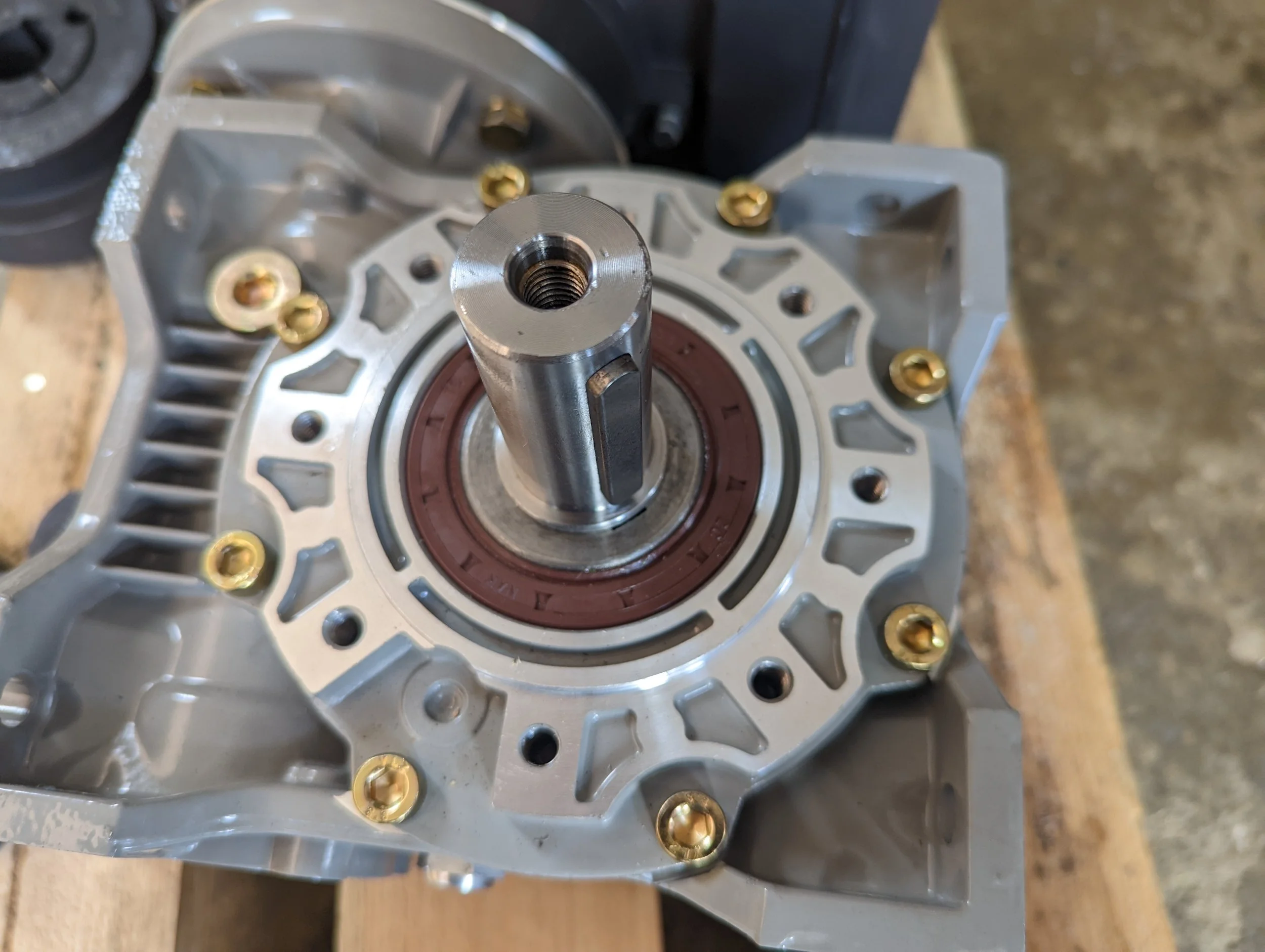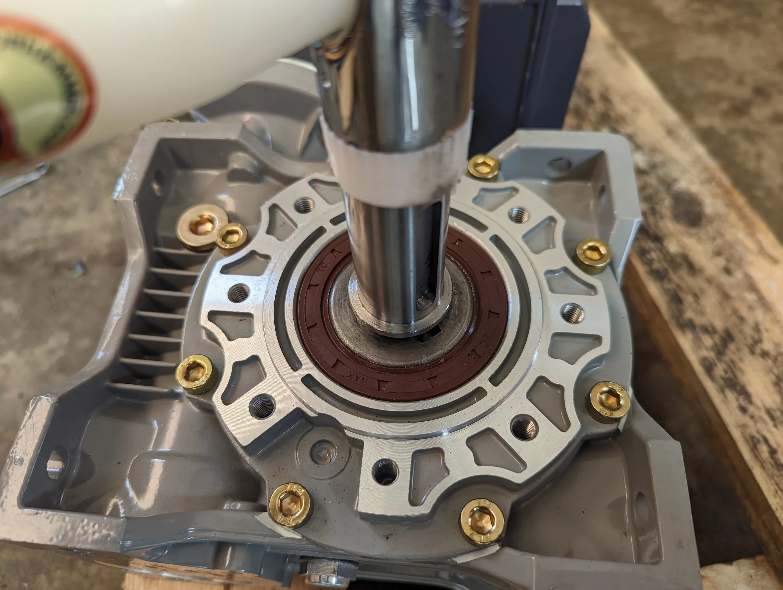With the shaft fully inserted, rotate the motor and gearbox to the other side. The shaft should be poking through by about 5-10mm.