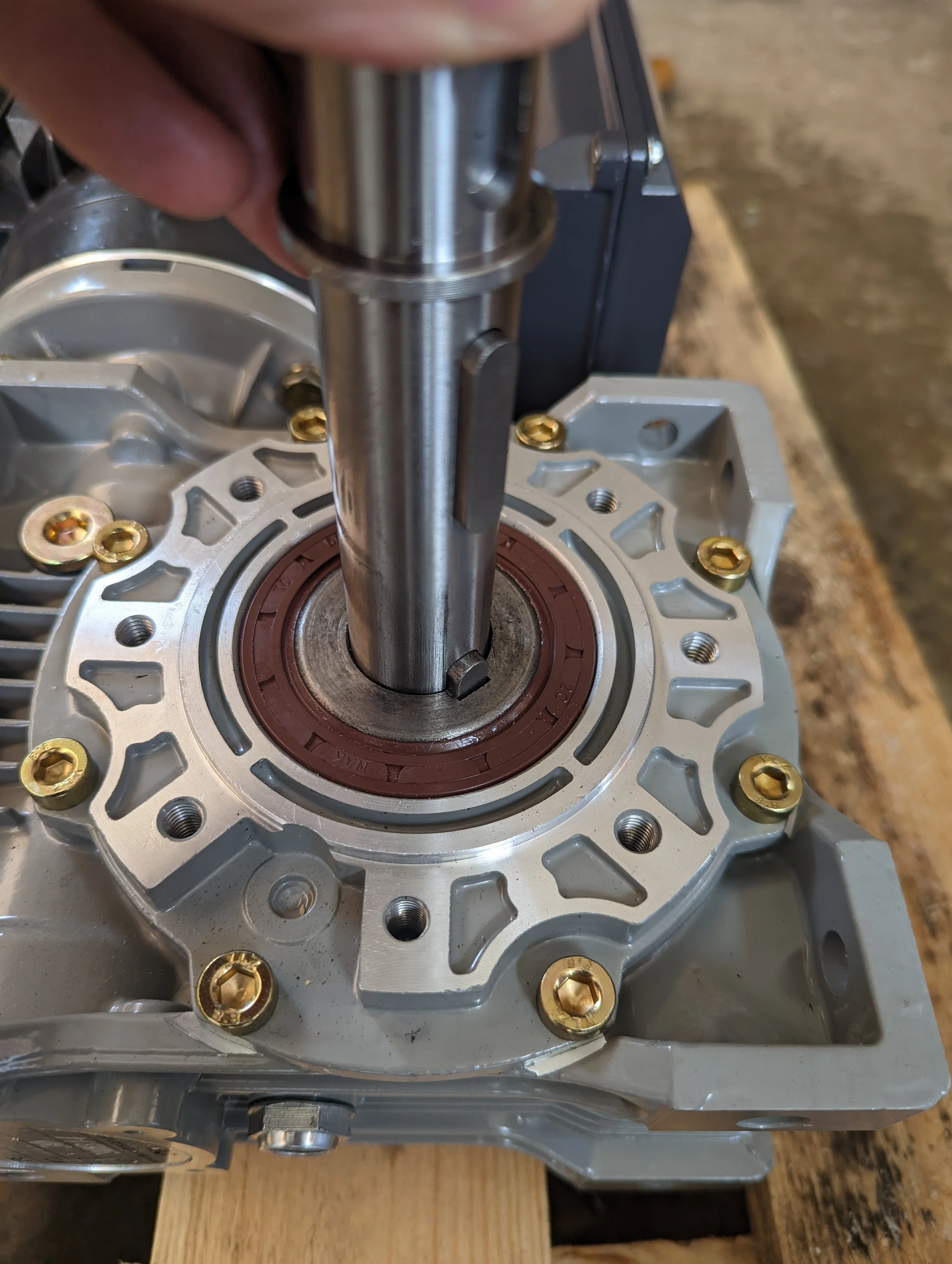 With these fully pressed down, slide the shaft into the gearbox. Aligning the keyway with the gearbox as shown.